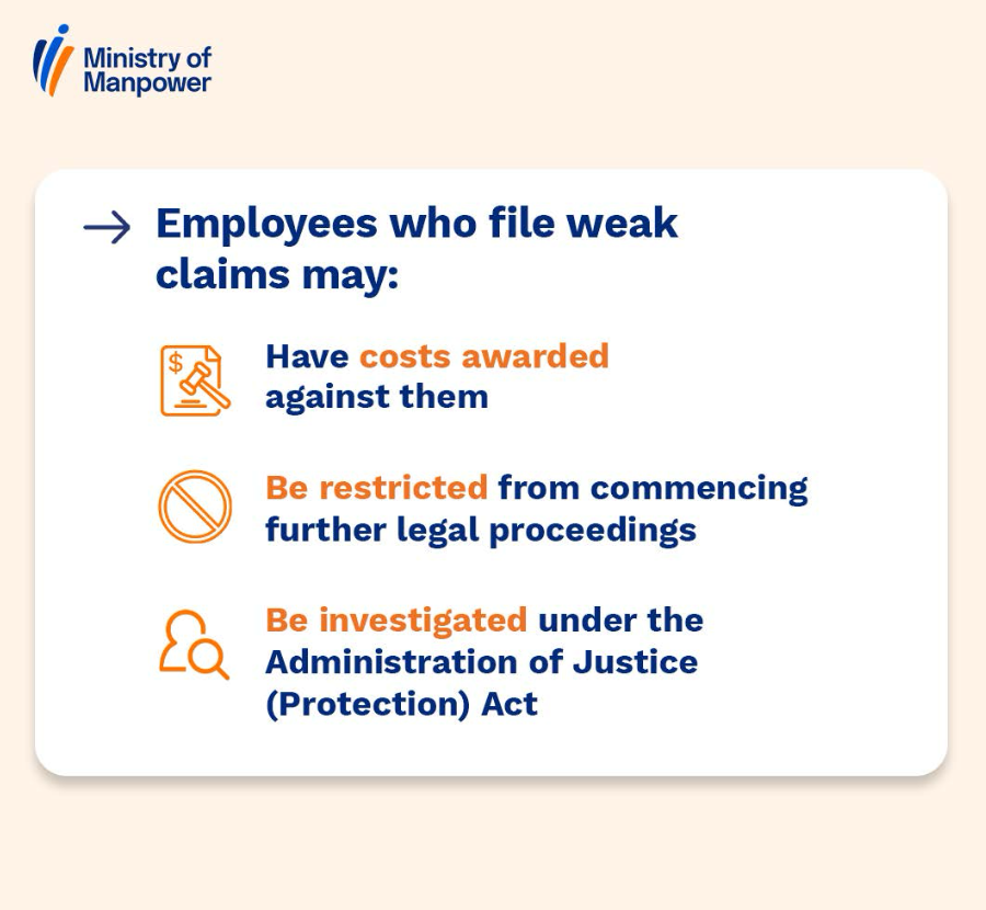 Employees filing weak or frivolous claims may be required to reimburse employers’ legal expenses, including attorney fees, court costs, and administrative expenses incurred during defense. | Courts may impose restrictions preventing repeated or abusive future filings by claimants who demonstrate patterns of vexatious litigation or bad faith claims. | Serious cases may trigger an investigation under the Administration of Justice (Protection) Act for potential misuse of legal processes or abuse of court procedures. |