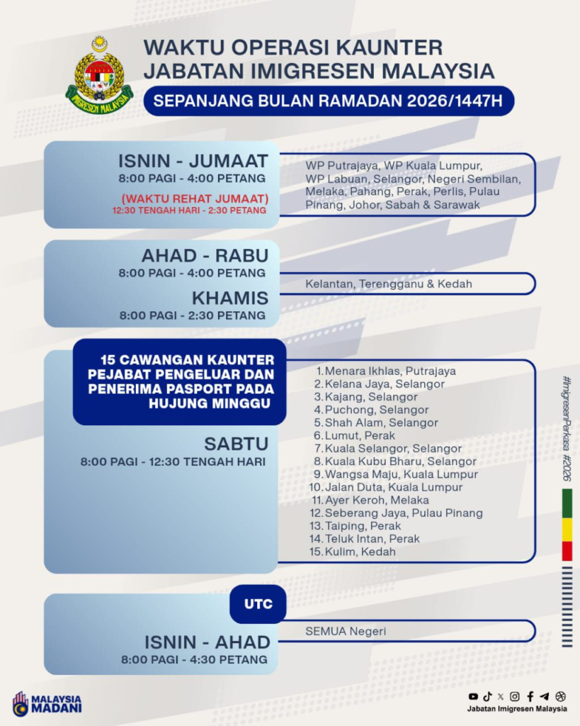 The Immigration Departmentโ€™s state and national counters also operate on modified hours during Ramadan. While exact times may vary by branch, service counters generally open earlier and close in the early afternoon, with extended breaks on Fridays to accommodate prayer schedules.